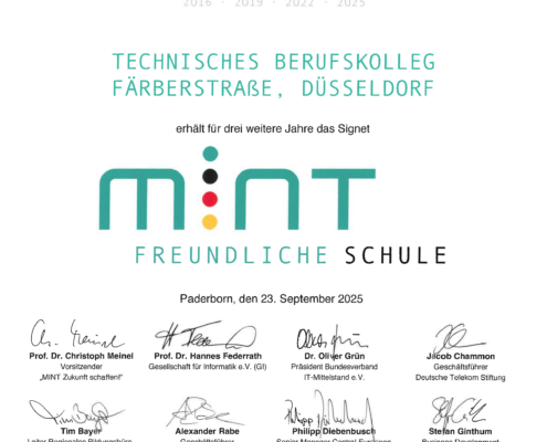 Am 23.09.2025 in Paderborn sind wir, das Technisches Berufskolleg Färberstraße, zum vierten Mal als MINT-freundliches Berufskolleg ausgezeichnet worden.