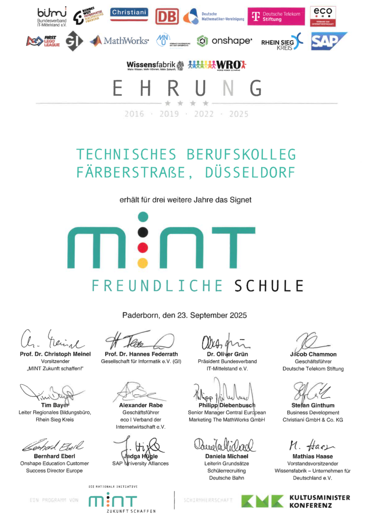 Am 23.09.2025 in Paderborn sind wir, das Technisches Berufskolleg Färberstraße, zum vierten Mal als MINT-freundliches Berufskolleg ausgezeichnet worden.